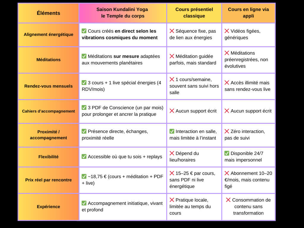 Avantage : 1 méditation d’approfondissement de kundalini yoga chaque mois en plus pour caler le mental en profondeur (en correspondance avec la vibration du mois)