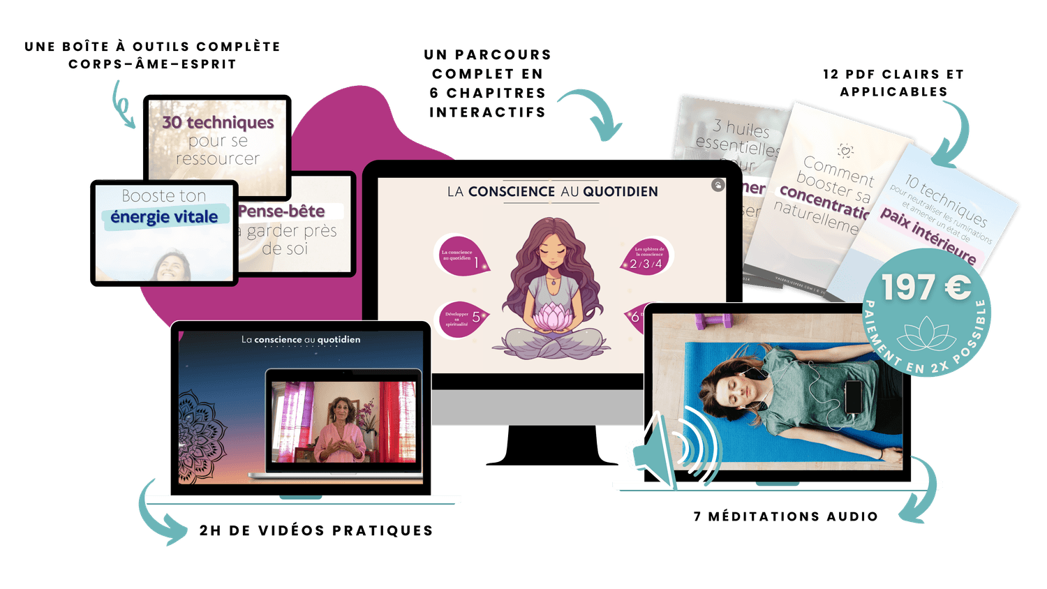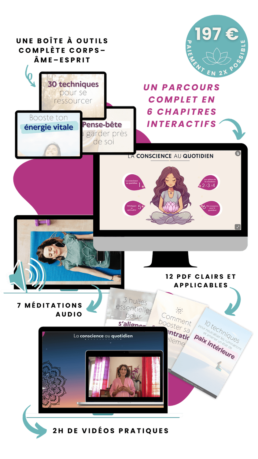 Aujourd’hui, je mets à ta disposition ce parcours simple et structuré, pour que tu puisses toi aussi ramener la conscience au cœur de ta vie.